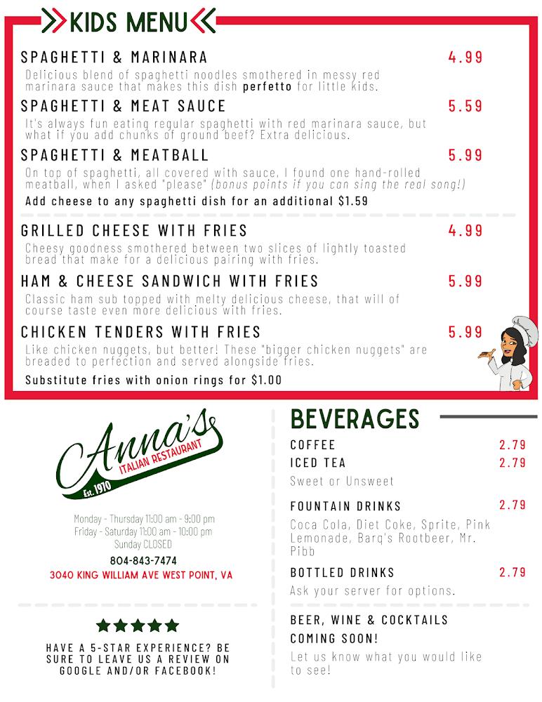 Welcome to Anna's Italian Restaurant in West Point, where authentic Italian flavors meet a warm family atmosphere. Located at 3040 King William Ave, we take pride in serving traditional dishes, from mouthwatering pizzas and subs to hearty pasta and delightful desserts. Our locally owned eatery offers both dine-in and takeout options, with weekly features that keep our menu exciting. Enjoy our spacious outdoor terrace or opt for convenient delivery services. We're committed to accessibility and excellent service, making lunchtime, dinner, or a solo meal a memorable experience. Join us and savor the taste of Italy in every bite!